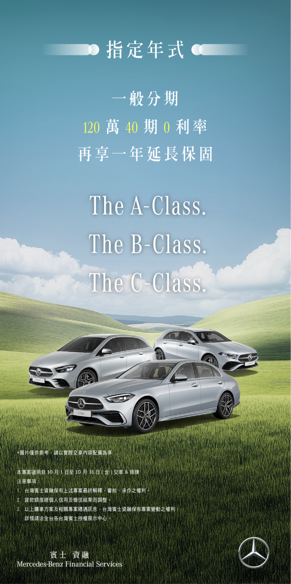 「靈感設計 × 都會節奏,讓駕馭成為風格日常」 The A-Class The B-Class The C-Class 指定年式 享 120 萬/40 期 0 利率優惠方案