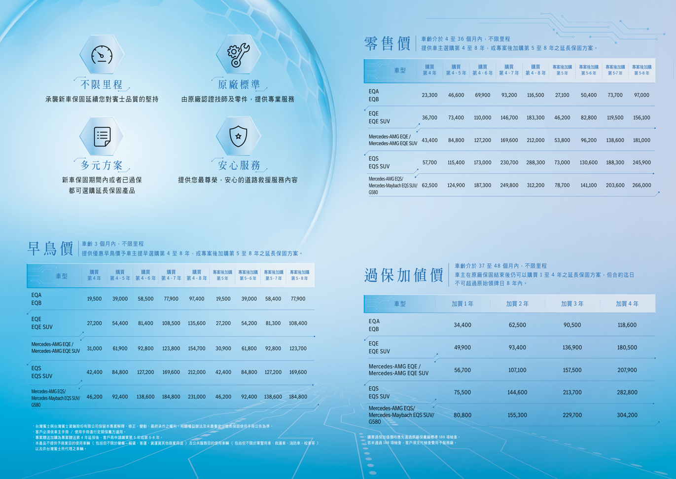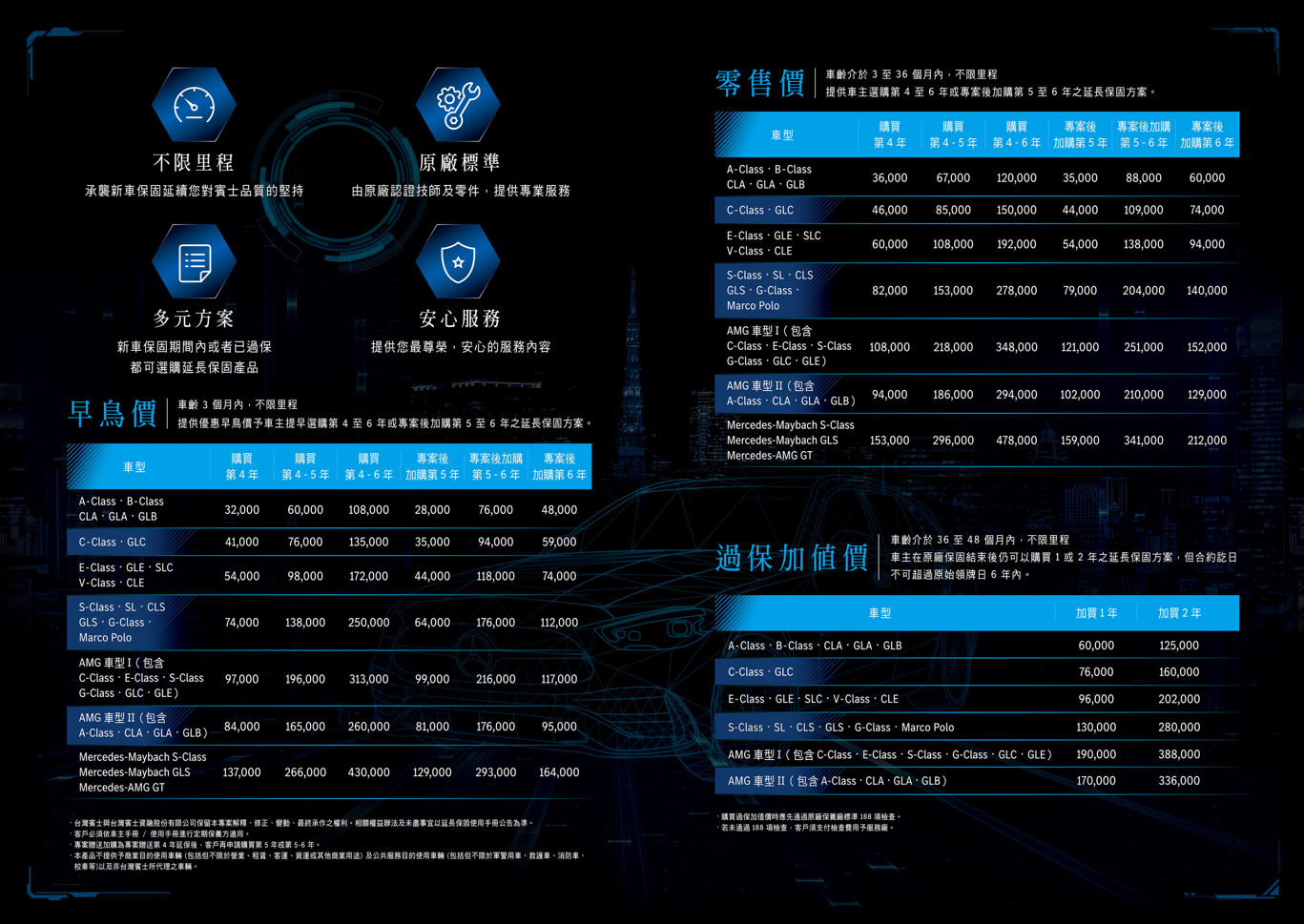 在 3 年不限里程保固之內,您可以自由選購第 4-6 年的專屬延長保固方案在您享受奔馳同時,坐擁放心無虞的旅程。保障更長久的尊榮禮遇!
